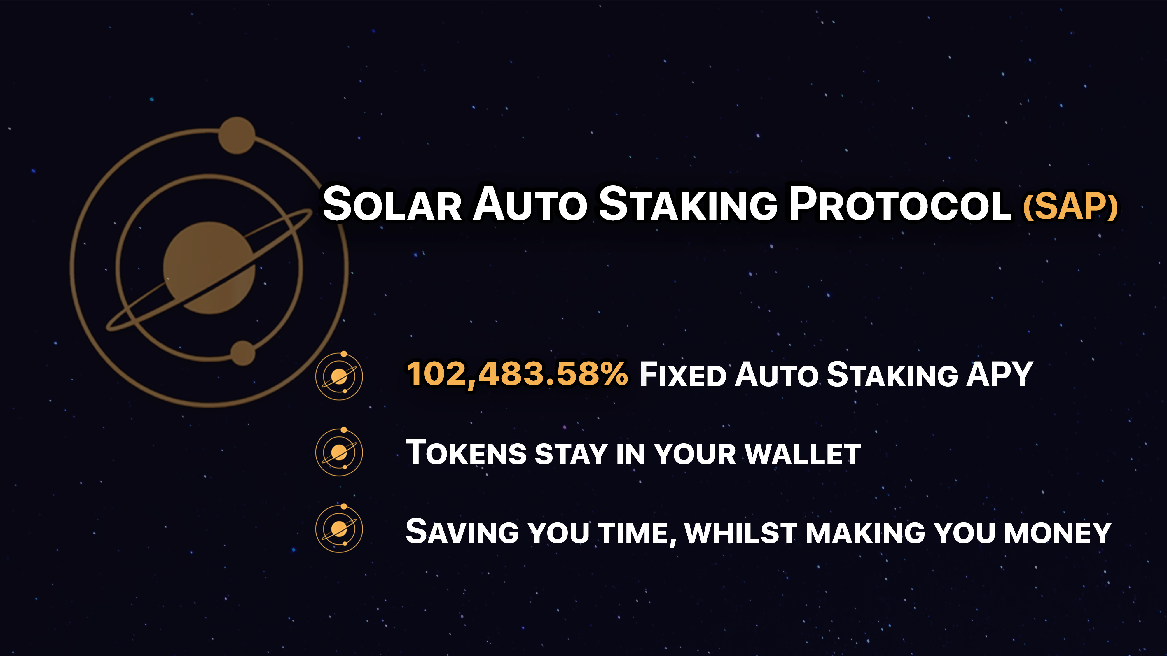 SAP gives the Solar token automatic staking and compounding features, and the highest Fixed APY in the market <mark style="color:yellow;">102,483.58%</mark>, a daily ROI (Return On Investment) of 1.917%. &#x20;